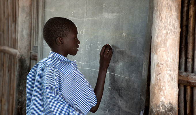 World’s View is one of six primary schools at Palabek and – like with the others – overcrowded temporary class space means learning takes place wherever shade can be found. There are 11,000 school-age children here, fewer than half of whom are registered, and there is only one secondary school. Two nearby Ugandan public schools have also opened their doors to refugee children.
