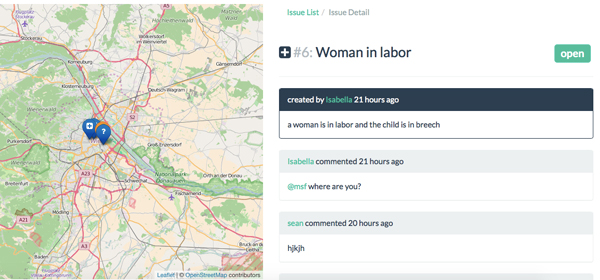 A user can create an issue, which is coded according to type of issue, such as a medical issue. For example, if a pregnant woman refugee is going into labour and is about to give birth, and there are three medical organisations in the area, the platform allows the organisations to coordinate who will respond. This avoids situations where more than one organisation goes to the same incident, wasting valuable resources.