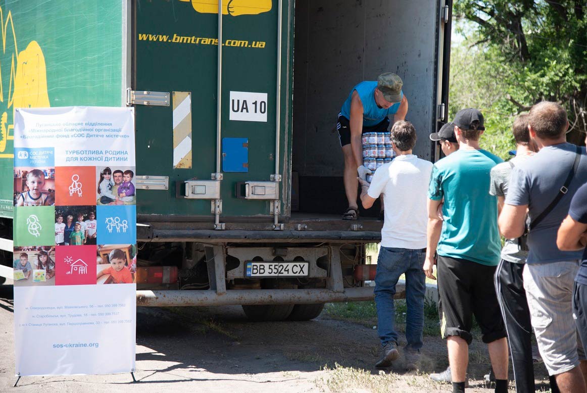 In Zolote, a community near the contact line, residents help unload relief supplies provided by SOS Children’s Villages.