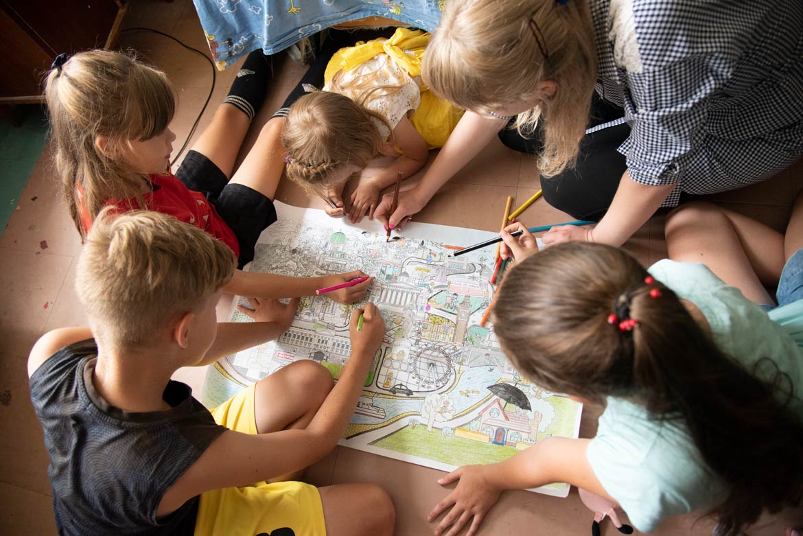 Here, children participate in a group activity with an SOS psychologist in Stanytsia Luhanska. “Because of the conflict, many of our medical and mental health specialists have left for other places. Those qualified to provide care have left even though the need is growing,” according to the head of the local hospital.